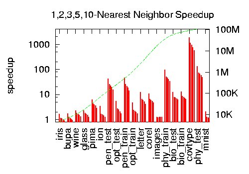 | Speedup of a cover tree over an optimized brute force approach for querying 1,2,3,5, and 10 (euclidean) nearest neighbors on a collection of datasets. |